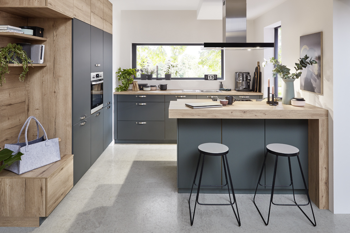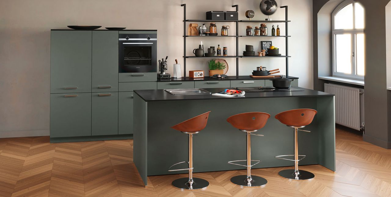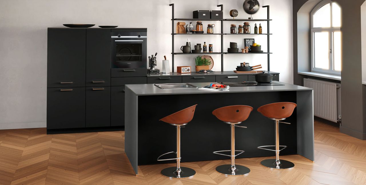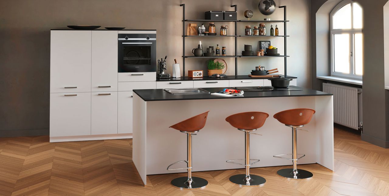 Inklusive Einbaubackofen in Schwarz / Edelstahl Siemens HB517GBS3 Energieeffizienzklasse A+, Glaskeramik Kochfeld mit Induktion und Kochfeldabzug (Umluft) Bora GP4U, Kühlschrank Laurus LKG88E Energieeffizienzklasse E, Einbauspüle Edelstahl Rodi NewManaus, Geschirrschrank, Stollenregalsystem, Esstheke, XL-Schränken.