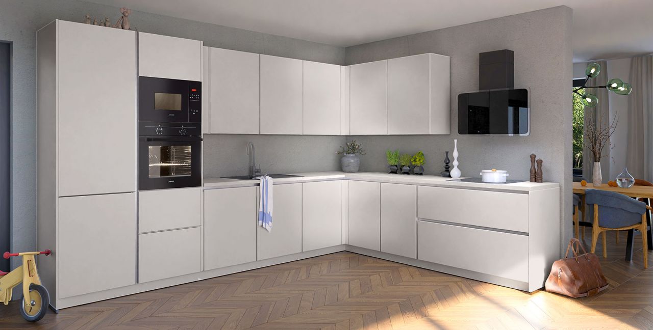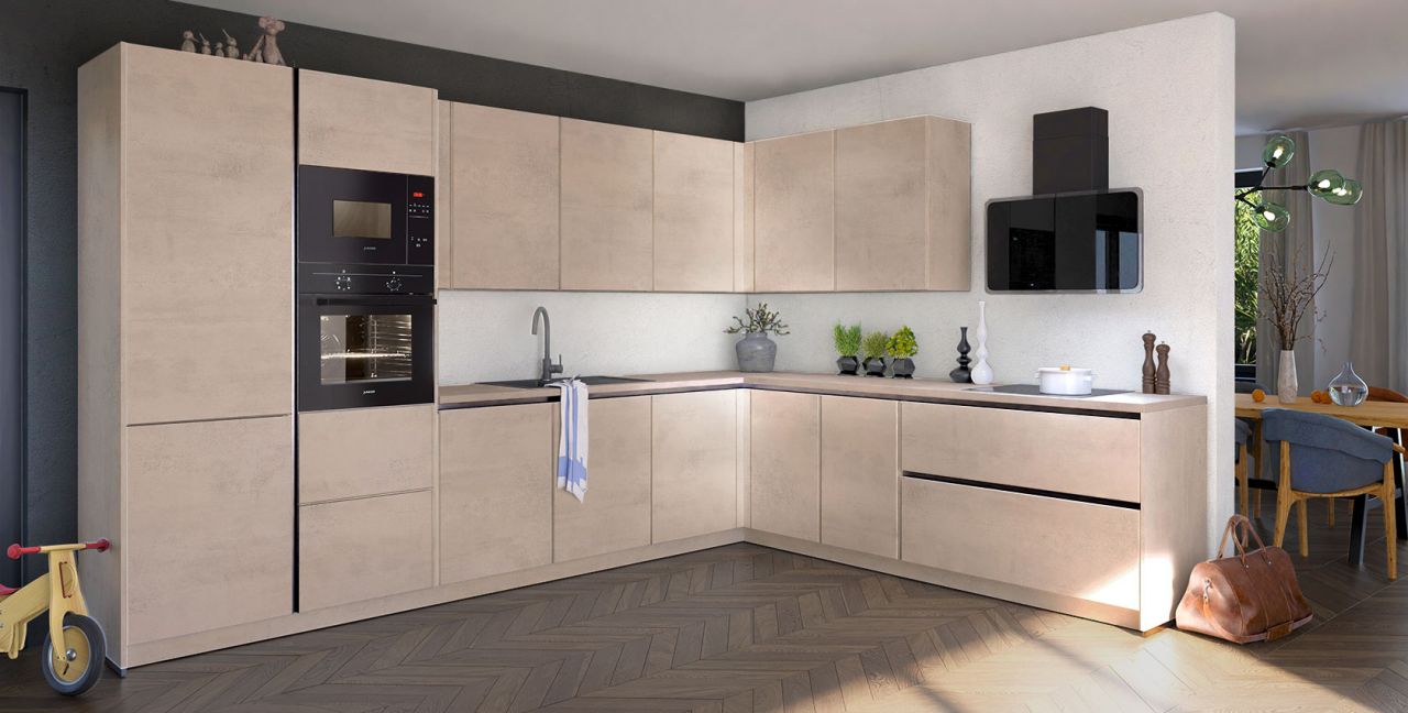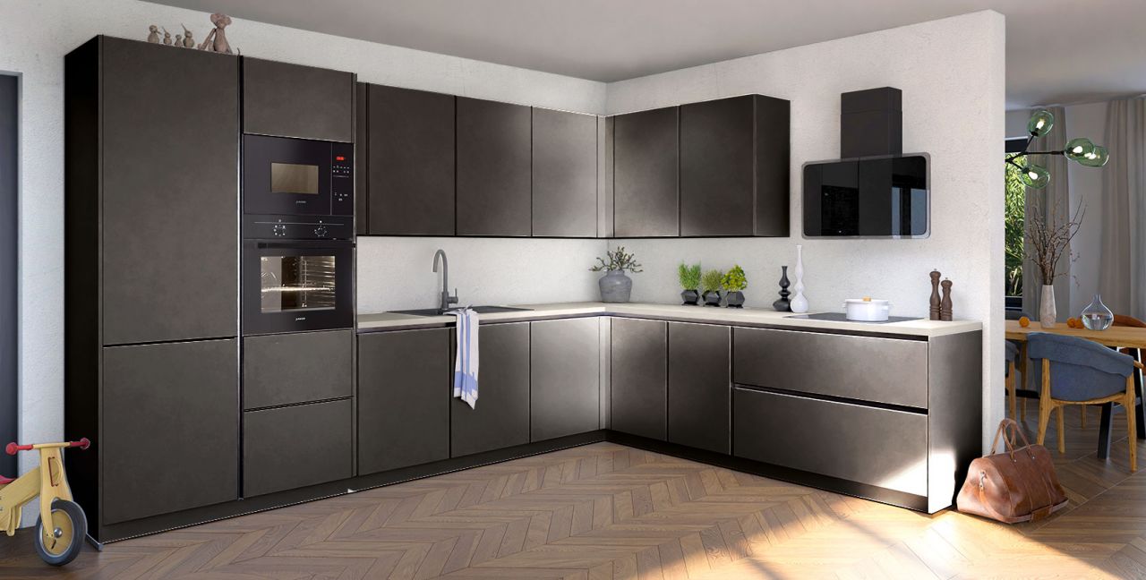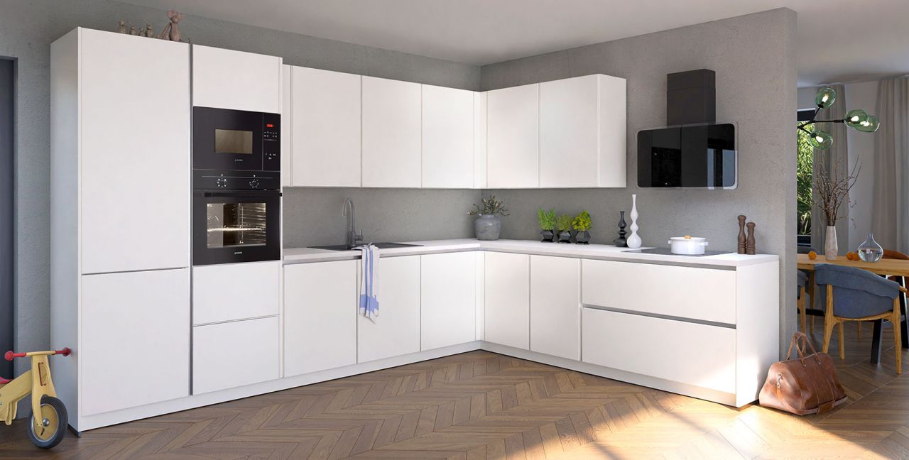Inklusive Einbaubackofen schwarz Junker JF1300061 Energieeffizienzklasse A, Glaskeramik Kochfeld Junker JR36DT54, Dunstesse Edelstahl / Glas Faber GLAM-FIT BK80 Energieeffizienzklasse A, Kühlschrank Progress PK0814 Energieeffizienzklasse E, Mikrowelle Junker JP4119260, Einbau-Designspüle Elleci Logik 300, XL-Schränken, Unterschrank mit Großraumauszügen.